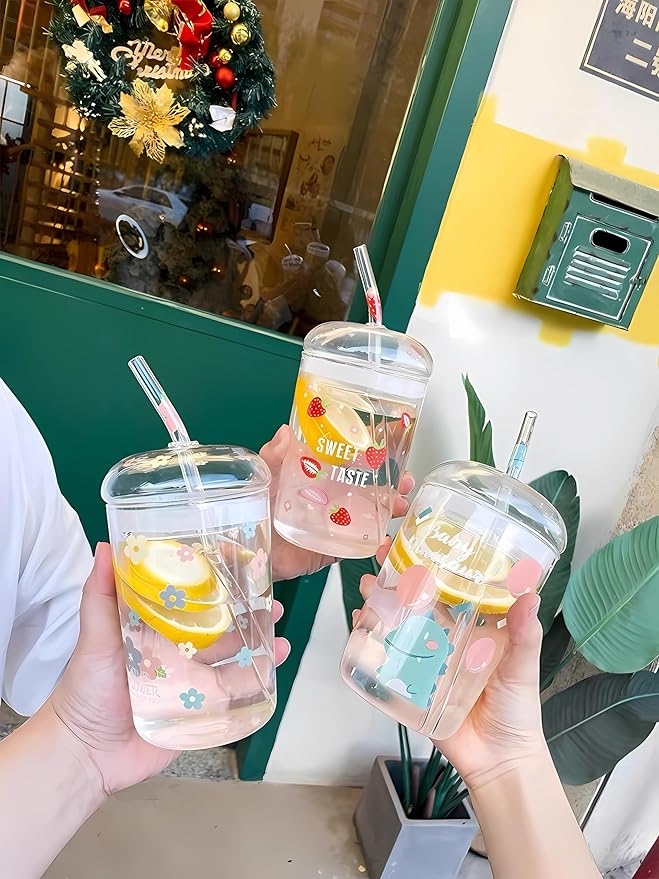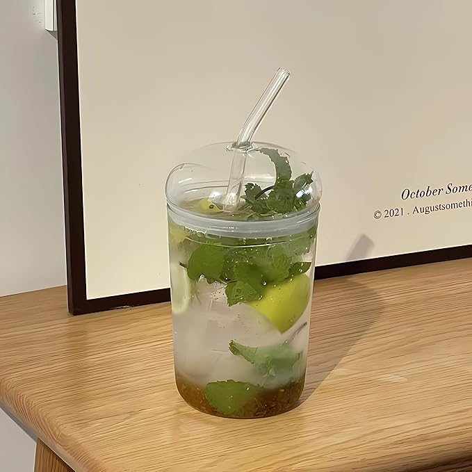 - 2 Drinking Glasses Set: 16oz Drinking glasses set includes 2 glass cups [ Diameter 3 in, Height 4.8 in],2 reusable glass lids,2 reusable glass straws and 1 cleaning brush, unique design.