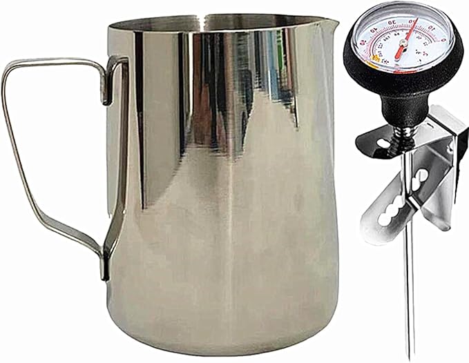 Milk Frothing Pitcher for Coffee, Barista Steaming Jug (21 Ounces with Thermometer Pen)