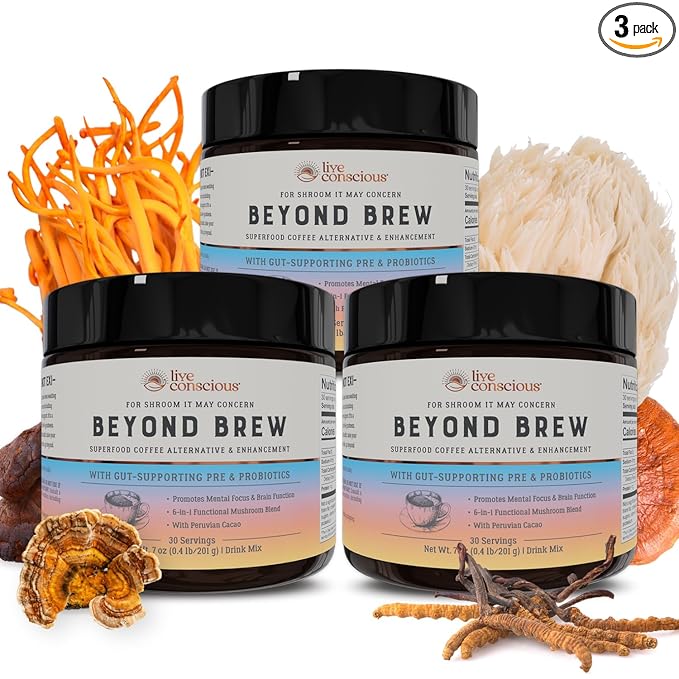 Live Conscious Beyond Brew - Superfood Coffee Alternative - Low Caffeine - Powerful Mushroom Complex - Lion’s Mane, Reishi, Cordyceps & Chaga for Sustained Focus, Energy & Immunity - Prebiotics & Probiotics Supports Gut Health - 30 Servings (3-Pack)