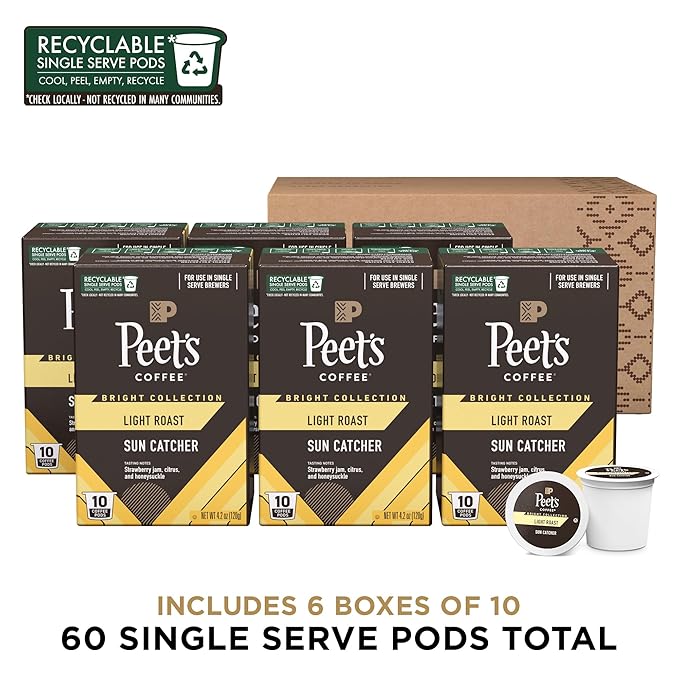 - Contains six (6) Box of 10 Peet's Sun Catcher Light Roast Coffee Single Serve Coffee Pods - 100% Arabica Coffee