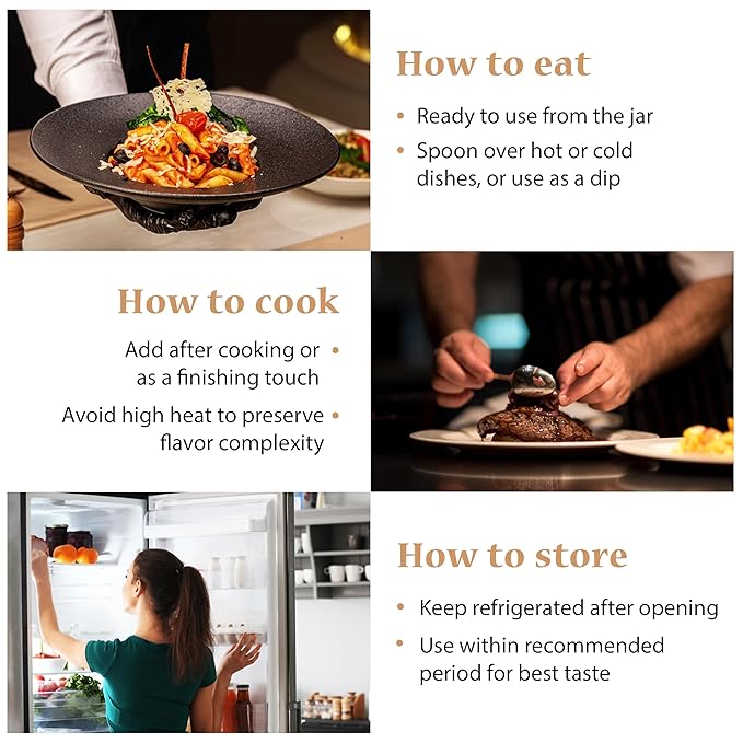 - Add heat and depth to any dish: Use our hot sauce as a finishing touch on warm pasta, risotto, eggs, toast, or grilled veggies. Just a spoonful is enough. Avoid heating this dip sauce above 40°C to preserve its flavor. Store our black truffle sauce in a cool place, refrigerate after opening, and enjoy within 7–10 days.