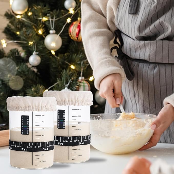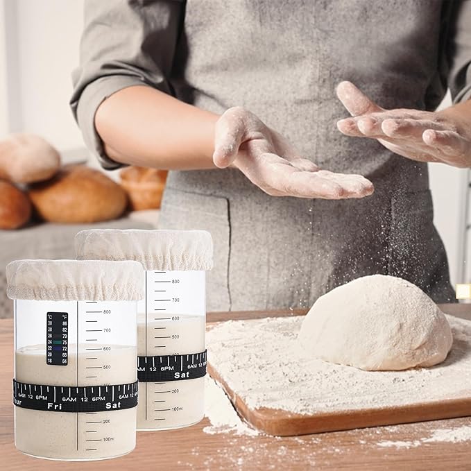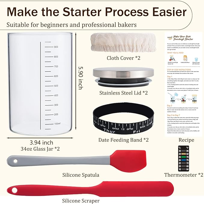 - Easy to Use: Whether you're a beginner or a pro, this sourdough starter kit will make the starter process easier. This kit includes two jars, two breathable cloth covers, two spatulas, two feeding marker bands, two temperature stickers, and a RECIPE (excludes starter culture)