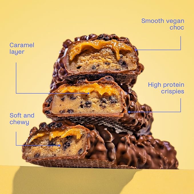 - HEALTHIER CHOCOLATE SNACK: A chewy & fudgy sweet vanilla cookie dough flavored center, topped with a layer of indulgent caramel & coated with smooth vegan chocolate & high protein crispy pieces, for a satisfying crunch; ideal on-the-go or office snacks