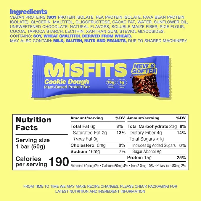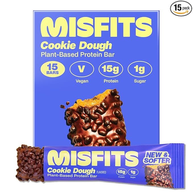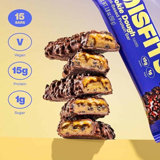 Misfits Vegan Protein Bars, Cookie Dough - Updated Recipe | Plant Based, Low Sugar & Carb, High Fiber Snacks | Pack of 15