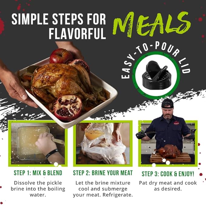 - A VERSATILE PICKLE BRINE SEASONING FOR FOR ANY OCCASION. Our seasoning in a pickle brine is excellent for small to medium food in the kitchen, with an easy-to-pour lid to sprinkle on your favorite dishes like pork, beef, veggies, and even seafood.