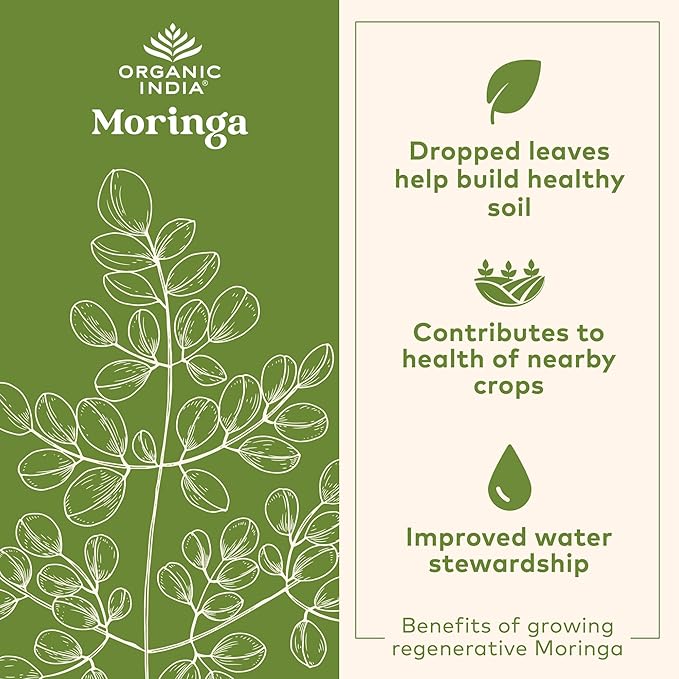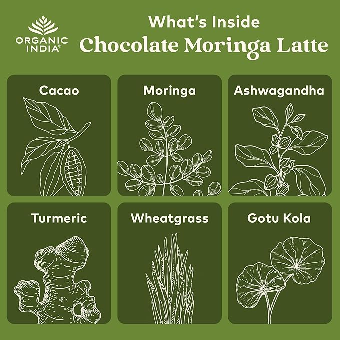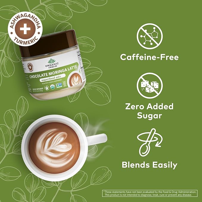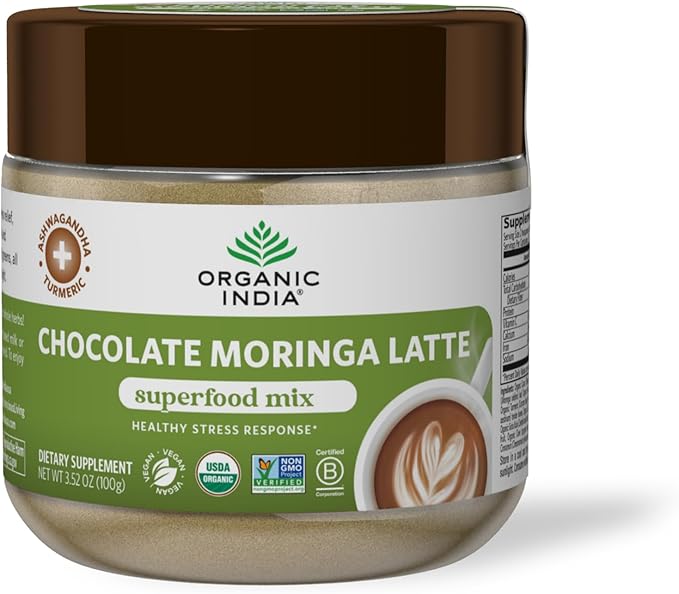 Organic India Chocolate Moringa Latte Powder - Superfood Mix, Moringa Leaf Tea, with Ashwagandha and Turmeric, Dietary Supplement, Stress Support, Rich Cocoa, Caffeine Free - 3.52 Oz