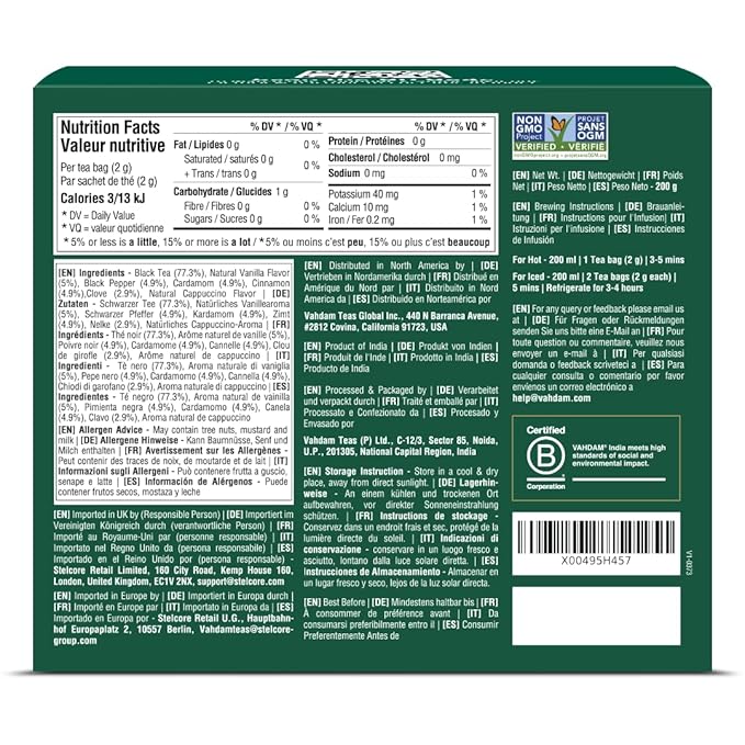 - 100% REAL INGREDIENTS - Each tea bag contains Black Tea blended with Cinnamon, Cloves, Cardamom, Black pepper and Extracts of Cappuccino and Vanilla. This specialty blend features an enveloping note of vanilla along with subtle hints of aromatic spices. Distinctly woody and earthy, the liquor feels ample in the mouth.