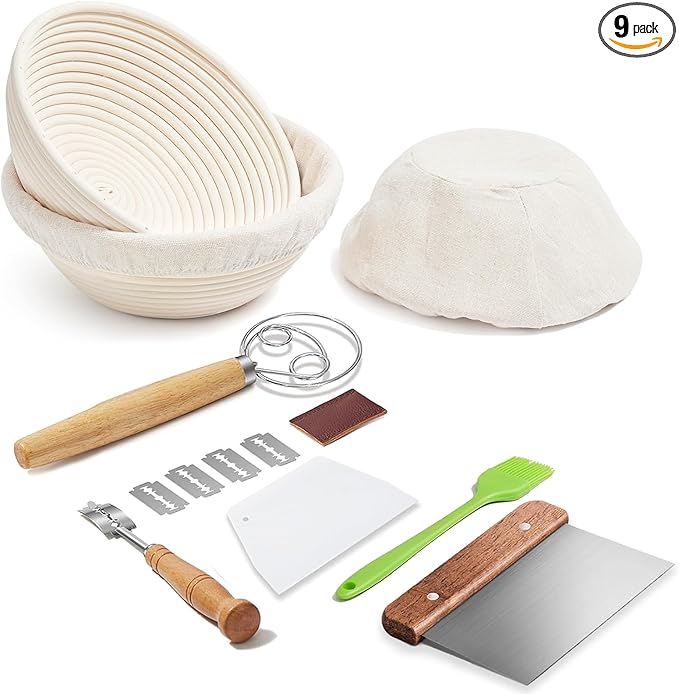 - COMPLETE SOURDOUGH STARTER KIT- Our Sourdough Bread Baking Supplies kit contains all the tools you need to bake delicious oven fresh bread. You will get 2 pack 9inch round bread proofing basket, linen liners, metal scraper, silicone brush, bread lame with 5 blades and 1 holster, danish dough whisk, and cutter knife. Feel the perfect baking experience with our sourdough bread baking supplies banneton bread proofing basket for all your baking needs.