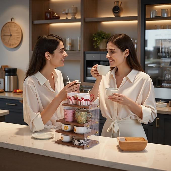 - 4-Tier Space-Saving Solution Wooden Cup Holder:14.2*8.2*9.8 inch. The Wooden Coffee Cup Holder is designed to efficiently organize coffee cups. Optimize countertops with open shelves designed to hold mugs, coffee bar accessories, plants, or decor. Lightweight yet sturdy, it organizes clutter while displaying items with easy-access visibility.Whether it's your kitchen, office, or cafe, it will help you maintain a neat and tidy environment., with each tier spaced to ensure stability and ease of access.