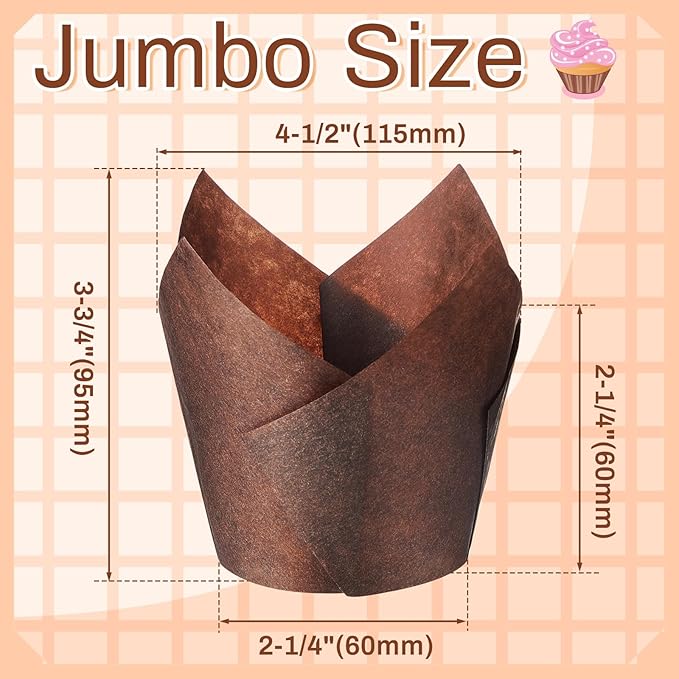 - Abundance in Quantity: in every pack, you will find 300 extra large tulip cupcake liners; 2-1/4" x 4" brown jumbo muffin liners, compared with ordinary cake liners, the diameter is larger, these are more than enough to serve, entertain, and cater to the needs of bakery owners, dedicated home bakers, or those looking for options to prepare a large number of cupcakes for festivities or gatherings