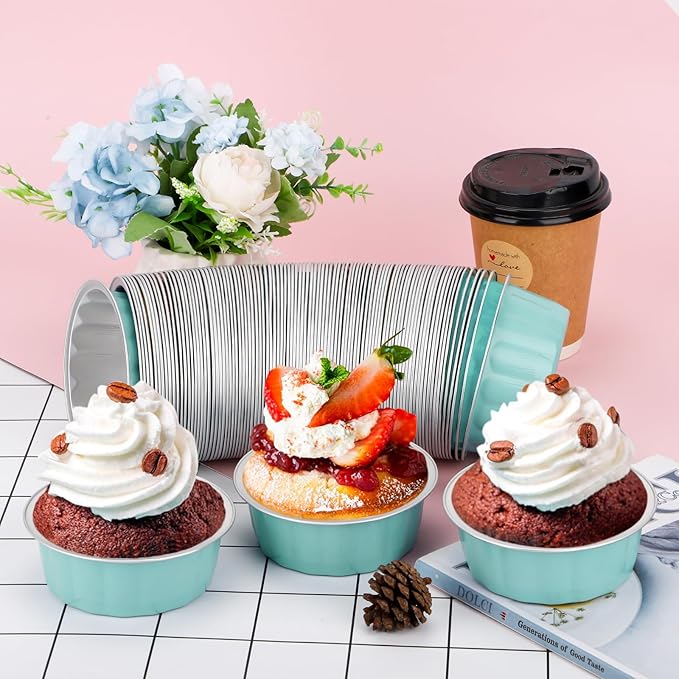 Beasea 8oz Aluminum Ramekins, 100 Pack 3.9" Mini Disposable Baking Foil Cups Ramekin Cup Cupcake Aluminum Baking Cups for Party - Lake Blue