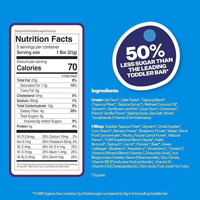 - Growing Brains & Bodies For A Brighter Future: YUMI Toddler Snacks contains +8 superfood veggies and is a good source of 3 essential nutrients. They're an excellent source of fiber and contain as much iron as 2 cups of spinach Give your child a nutritional advantage with these kids bars formulated with their development in mind.