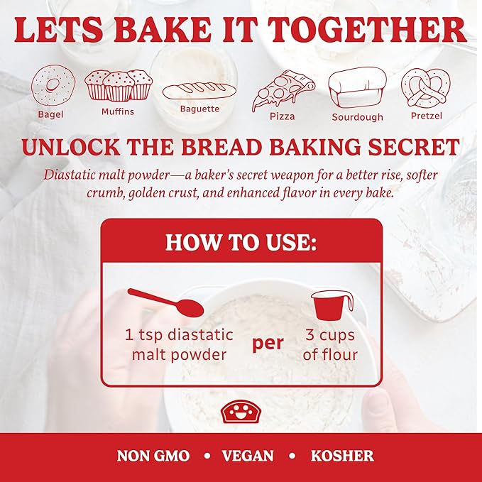 - 🥯SIMPLE TO USE FOR CONSISTENT RESULTS: Easily incorporate our malt powder into your favorite recipes. Just add 1 teaspoon per 3 cups of flour to see a noticeable improvement in dough conditioning and baking performance, perfect for both novice and expert bakers.