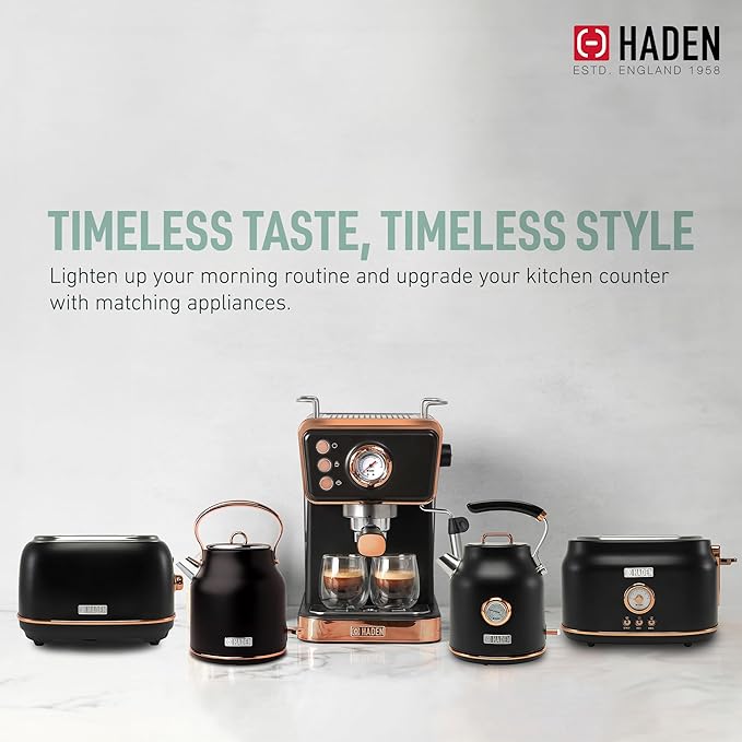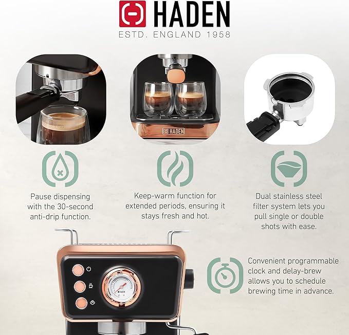 - Upgrade Your Morning: Elevate your kitchen with this HADEN espresso coffee maker, where classic style meets contemporary living; Exuding cleanliness, quality, and performance, the espresso machine showcases a modern approach to kitchen appliances