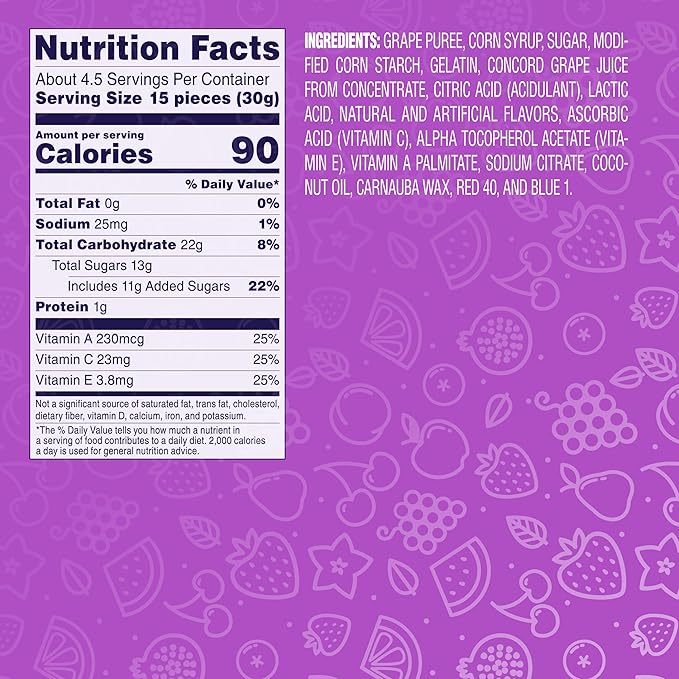 - GLUTEN FREE SNACK PACKED WITH VITAMINS - Welch’s Fruit Snacks deliver 25% of your daily value of Vitamin C, A & E. They’re also a Gluten Free Snack and Fat Free.