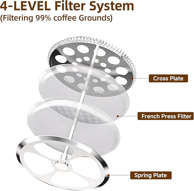 - 【4-Level Filter System】The coffee plunger use double-screen filter technology,with 4 stainless steel screens(2 of them is placed separately and can be added or used as a replacement at any time when needed), filtering 99% coffee grounds out that you can enjoy the smooth and rich-flavored coffee.
