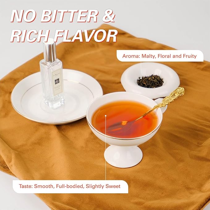 - 【No Bitter & Rich Flavor】Black loose leaf tea has a smooth, full-bodied and a slight sweetness with notes of malt, floral and fruity. This tea is also low in tannins, making it less bitter than other black teas