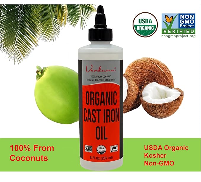 Verdana Cast Iron Seasoning Oil – 8 Fl Oz - Organic, Food Grade, Kosher, Non-GMO - Coconut Derived – Cleans, Conditions & Prevents Rust – No Mineral Oil – For Skillet, Grill, Pan