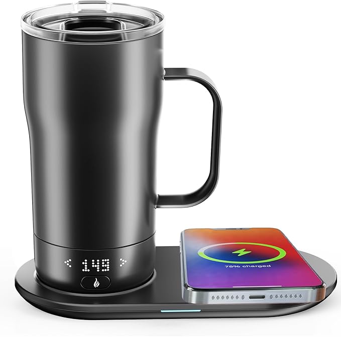 - 【2-IN-1 function AI Chip Smart Mug】AI chip smart identification and detection of devices. Just plug the adapter into the socket and put the cup in, the coffee heater will work, place the phone and automatically switch to charging mode. Temperature Control Smart Mug keep your coffee, tea, hot chocolate, chai, cider, mulled wine and other beverages at the perfect temperature! Take this innovative heated coffee mug with you in your car, office, errands or anywhere else you decide to go.