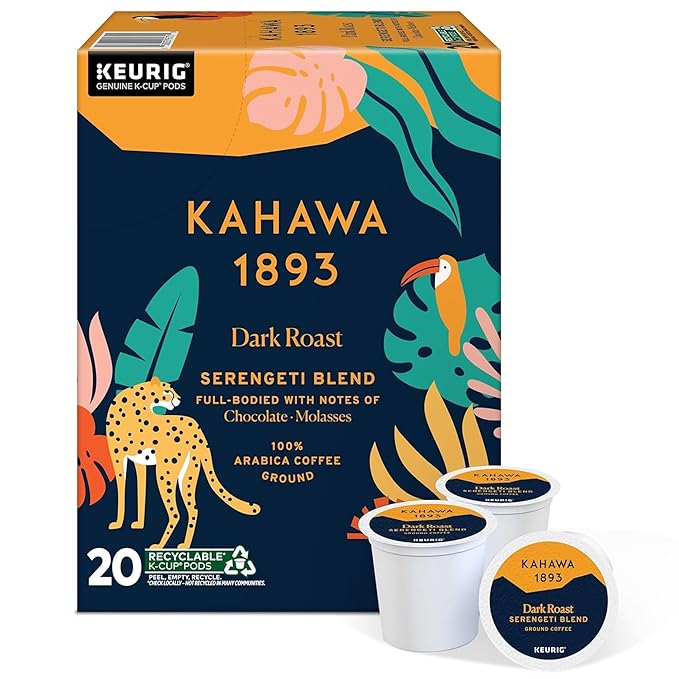 Kahawa 1893 Dark Roast Coffee K-Cup Pods Serengeti Blend (20 Count) - As Seen on Shark Tank, Low Acid, High Antioxidants, Naturally Sweet, Organically Grown, Ethically & Sustainably Sourced