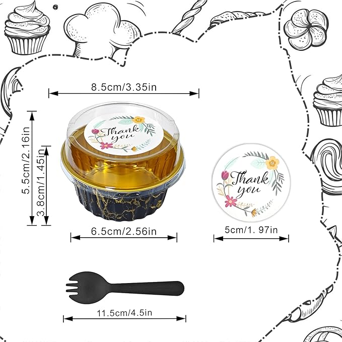 - Cupcake Liners With Lids Set: You will receive 100 pack aluminumfoil cupcake liners with 100 matching transparent lids,free 100 individually wrapped spoons,and 102 pcs thank you stickers thank you stickers, Capacity: 5oz (125 ml)