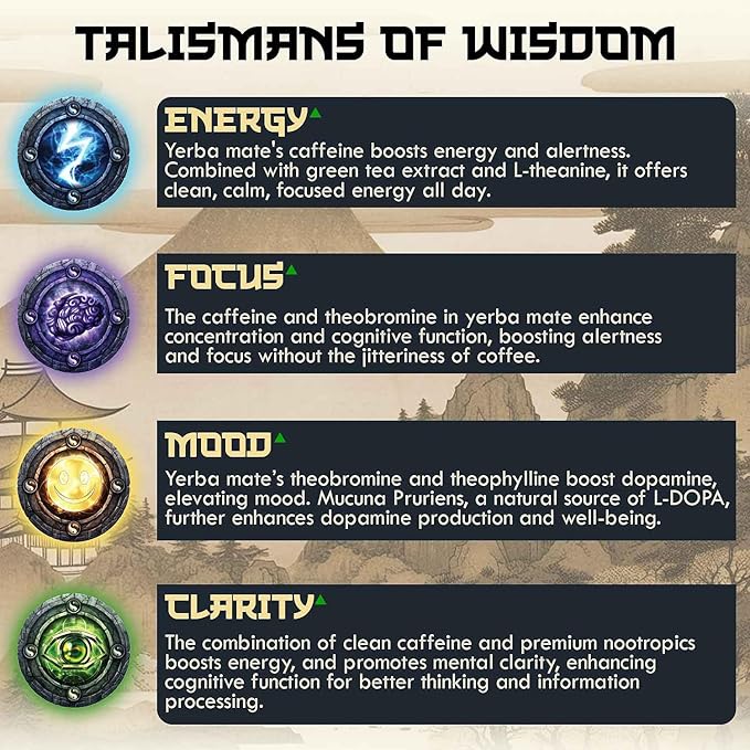 - CLEAN ENERGY WITHOUT THE CRASH: Powered by Yerba Mate, Green Tea and L-Theanine, Wisdom Tea delivers smooth, sustained energy without the jitters of coffee or the crash of energy drinks. Feel sharp, calm, and focused - all day.