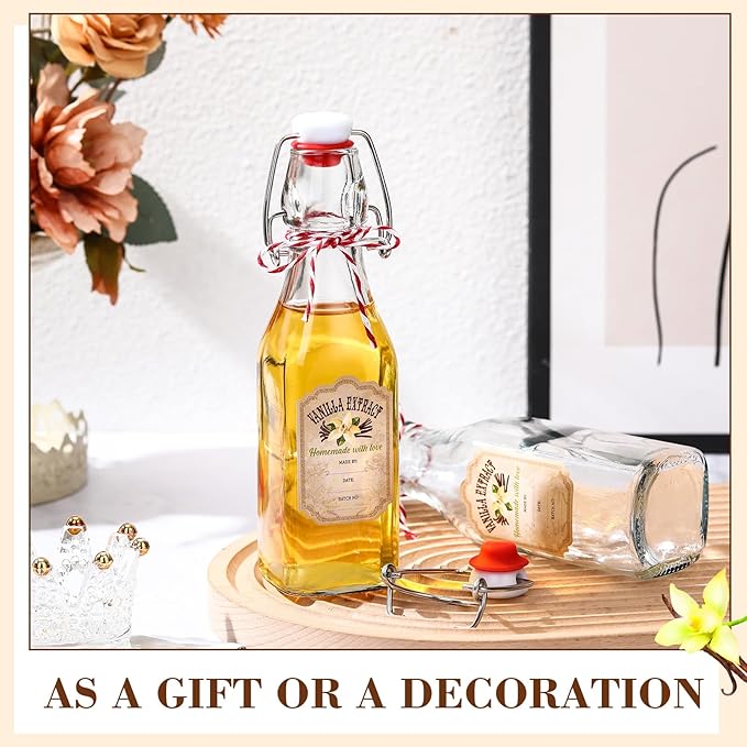 - Quality Material: the vanilla bottles are exquisitely made from durable, clear glass and the leak proof swing top is mainly crafted from sturdy metal, keeping your drinks fresh; This ensures long lasting use and offers nice visibility for users to easily identify the contents inside; The vanilla bottle labels are made of paper and the rope is made of cotton, not easy to break or fade