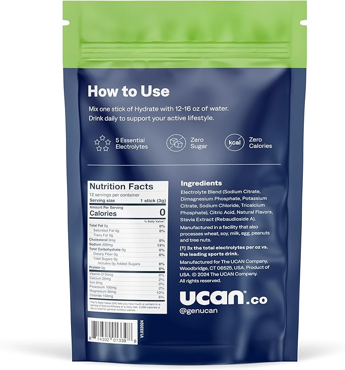 - ESSENTIAL HYDRATION BOOST: Hydrate healthier and skip the sugary sports drinks. UCAN Hydrate provides fast, effective hydration with 5 essential electrolytes to enhance workout performance, mental clarity, and overall wellness. Ideal for active lifestyles and daily hydration.