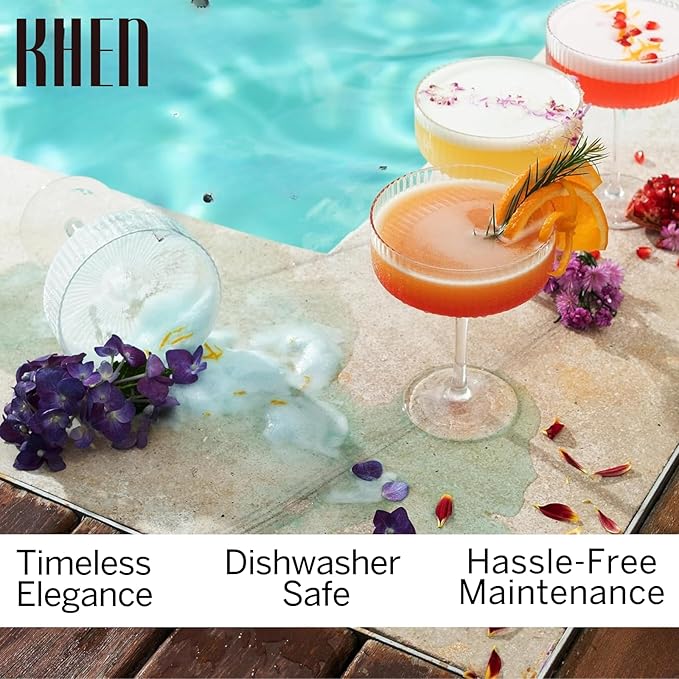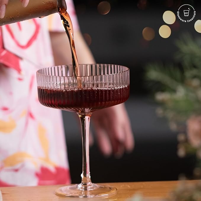 - ELEGANT VINTAGE DESIGN: The Khen Ribbed Vintage Art Deco Coupe Glasses feature a stylish ribbed texture inspired by classic Art Deco design. These 12 oz glasses add sophistication and charm to any table or bar setup.