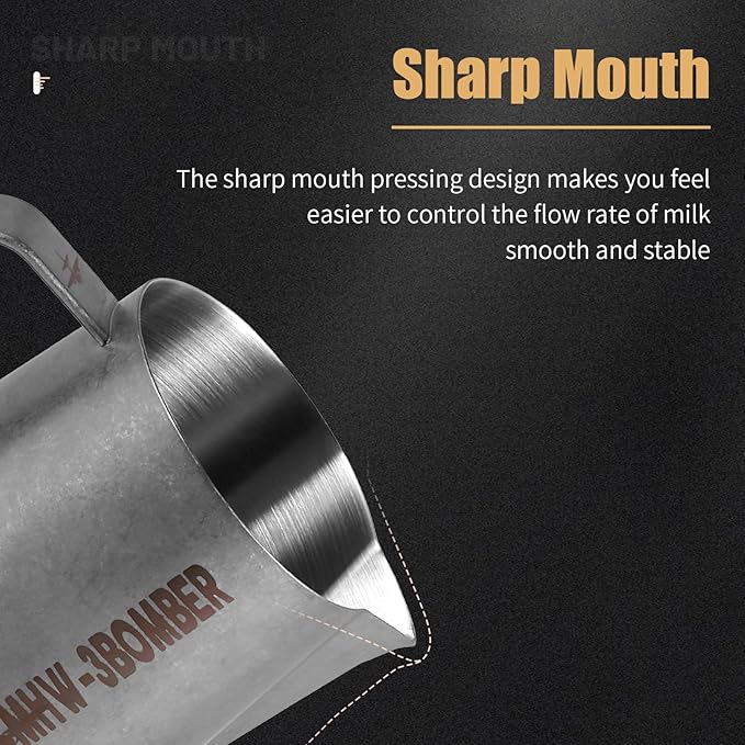 - Double Arc-shaped Guide Grooves: This milk frothing pitcher is equipped with innovative front and rear dual guide grooves design, enhance milk gathering, ensuring a smoother and more stable pour for perfect latte art.