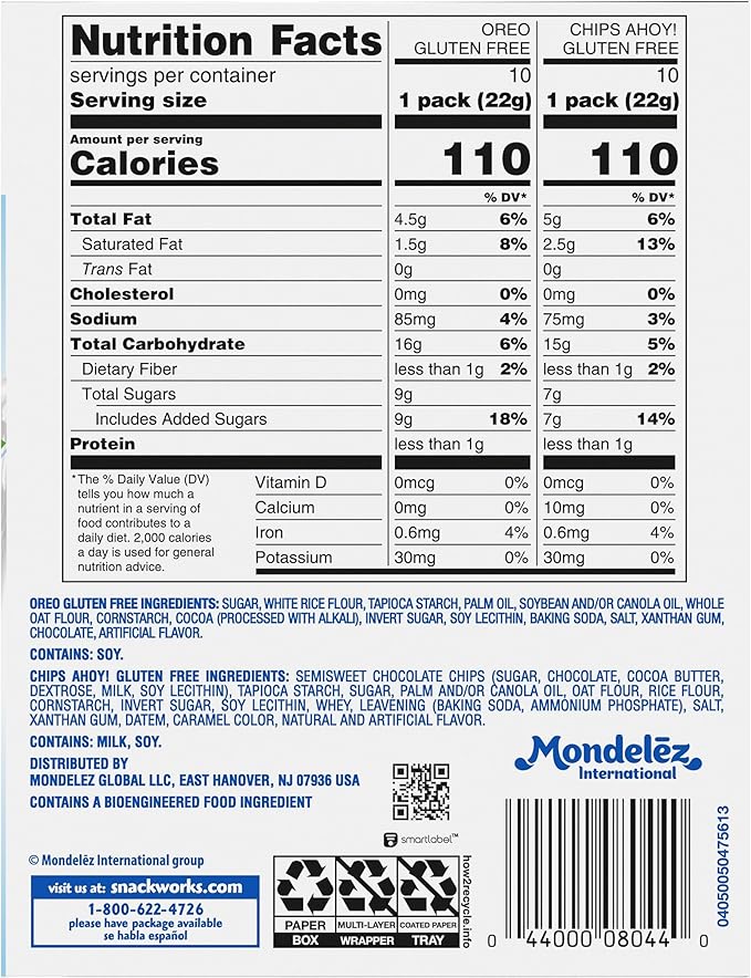 - 20 total snack packs of gluten free cookies, including 10 Gluten Free OREO Chocolate Sandwich Cookies and 10 original Gluten Free CHIPS AHOY! Chocolate Chip Cookies; 2 cookies per snack pack