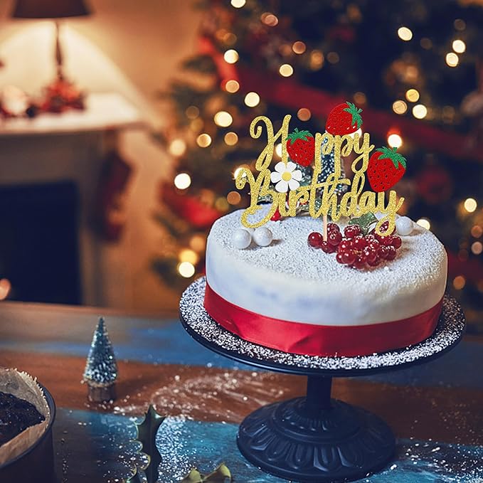 1 Pack Happy Birthday Cake Topper Glitter Strawberry Cake Pick for Fruit Theme Baby Shower Kids Birthday Party Strawberry Fruit Party Cake Decorations Supplies Gold
