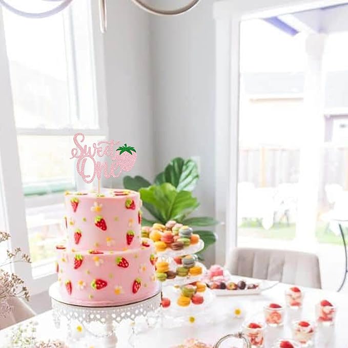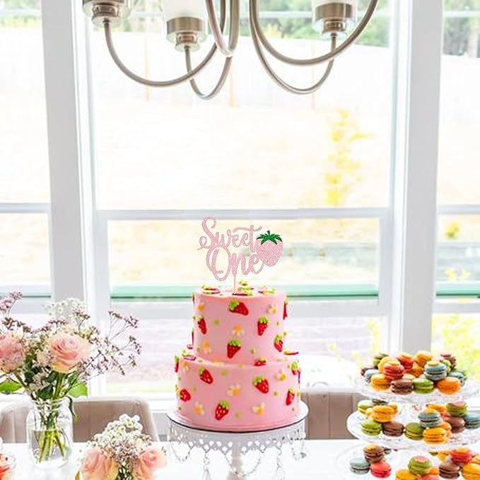 1 Pack Sweet One Cupcake Topper Glitter First Birthday Strawberry Cake Pick for Fruit Baby Shower 1st Birthday Berry Sweet Cake Decorations For Birthday Party Supplies Pink