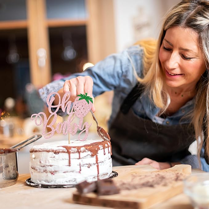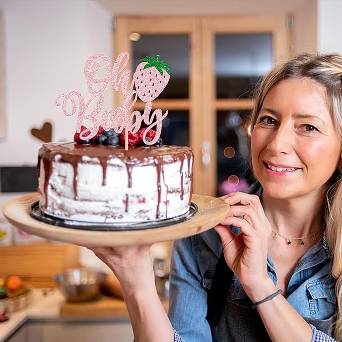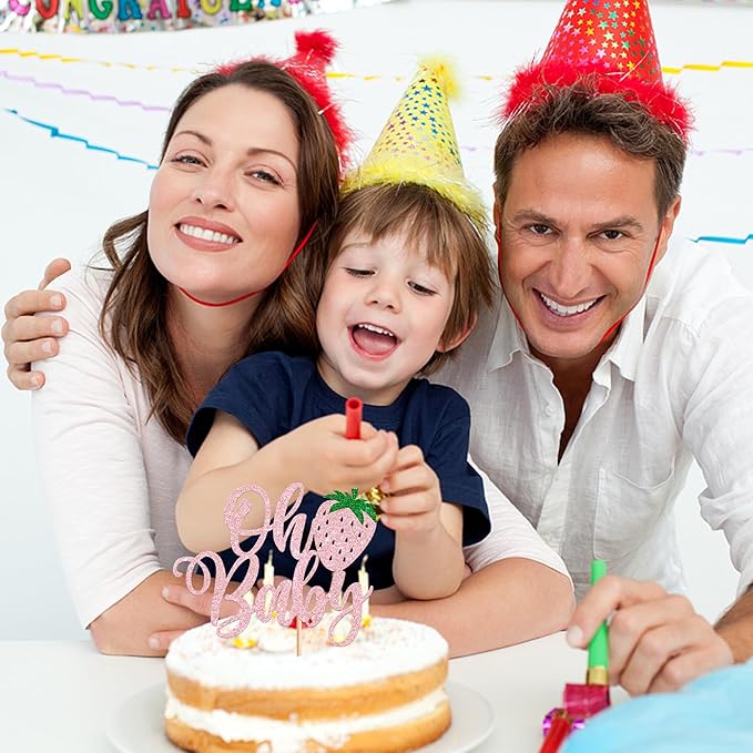 YCTHUNFISH 1 Pack Sweet Oh Baby Cake Topper Glitter Strawberry Cake Pick Fruit Berry Cake Decoration for Summer Baby Shower Kids Birthday Party Supplies Pink
