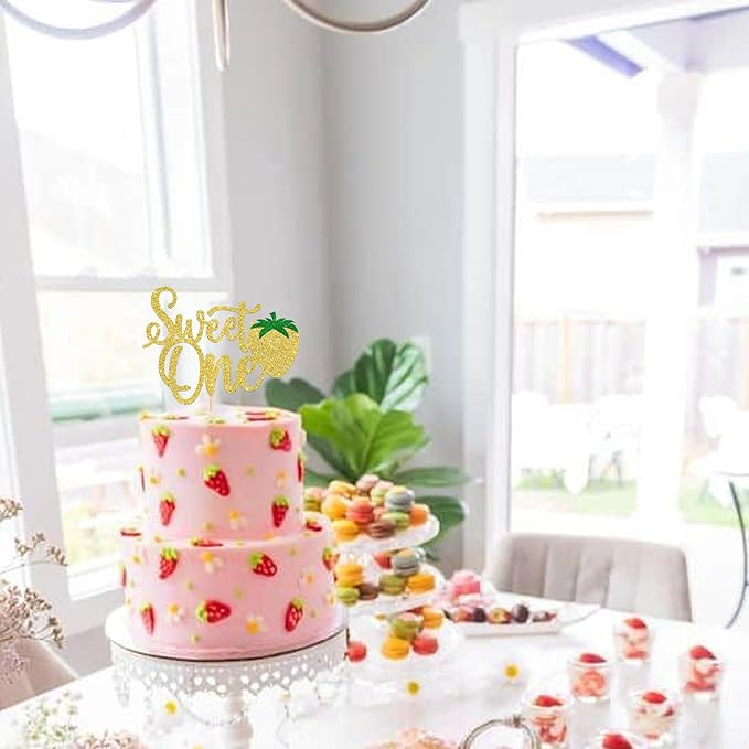 1 Pack Sweet One Cupcake Topper Glitter First Birthday Strawberry Cake Pick for Fruit Baby Shower 1st Birthday Berry Sweet Party Cake Decorations Supplies Gold