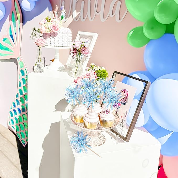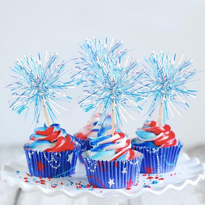30 PCS Foil Firework Cupcake Toppers Happy Birthday Cupcake Toppers Sparkle Tinsel Flower Drink Stirrers Cocktail Fruit Toothpicks for Valentine's Day Baby Shower Party Cake Decor Supplies Blue