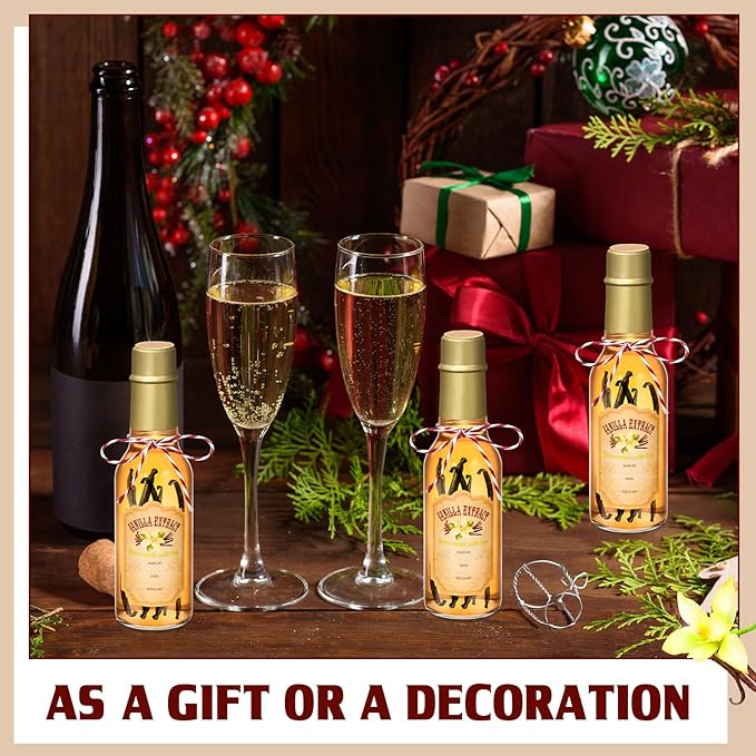 - Dimensions and Materials: elevate your bottle collection with our mini wine bottles for favors, measuring about 6.69 inches/ 17 cm in height and 1.85 inches/ 4.7 cm in diameter; These 5 oz capacity bottles ensure ample storage; Our vanilla essence stickers, made of paper, measure up to 1.69 x 2.48 inches/ 4.3 x 6.3 cm; To wrap it all up, we offer a roll of red and white cotton rope, about 10 meters long with a promise of durability, attractiveness, and resistance against breaking
