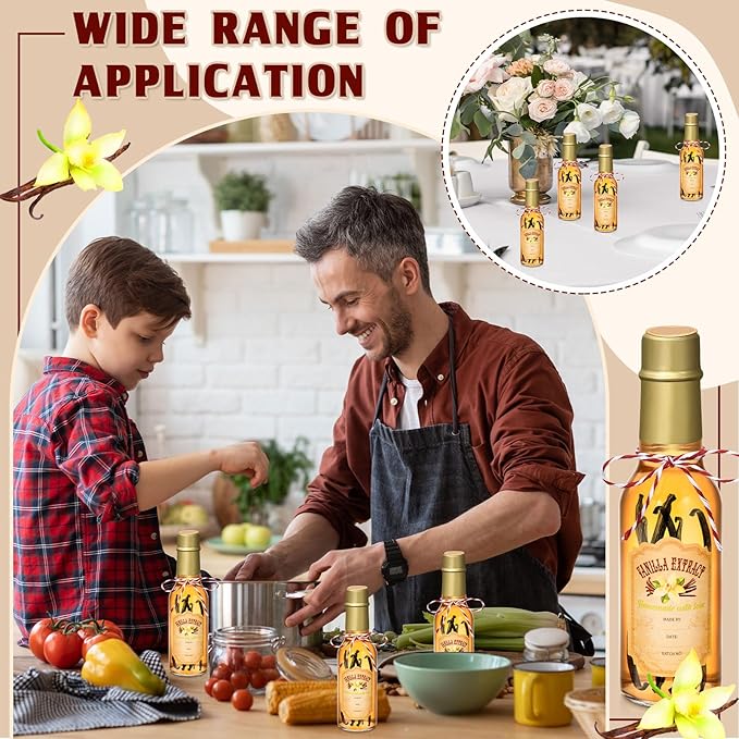 - Ideal for Gifting: with our medium sized pantry labels, showcase your creative talents to your loved ones; Consider writing the creation date and your name on our elegantly designed vanilla essence stickers, and attach them onto our clear glass bottle using a string; Fill them up with your homemade vanilla essence, seal snugly with heat shrink tape, and you have a nice present for family and friends for housewarming, birthdays, Wedding, Thanksgiving, Christmas, and countless other occasions