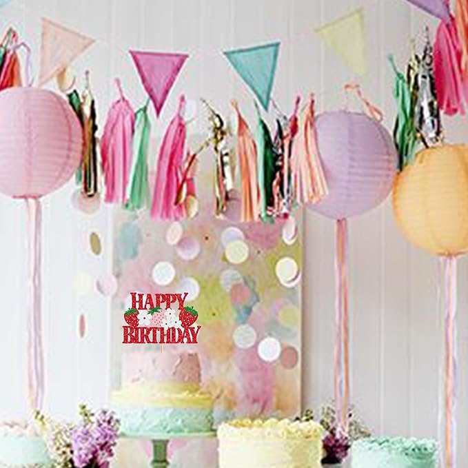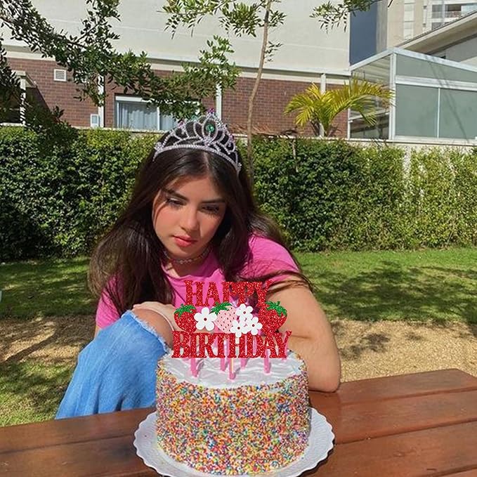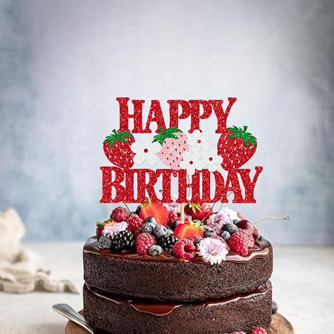 1 Pack Strawberry Happy Birthday Cake Topper Red Glitter Flower Strawberry Cake Pick for Fruit Theme Baby Shower Kids Birthday Party Strawberry Party Cake Decorations Supplies
