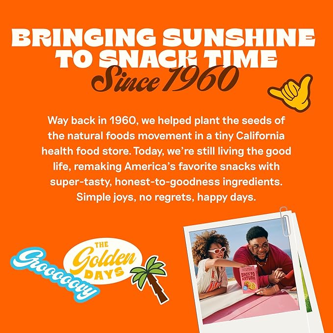 - BRINGING SUNSHINE TO SNACKTIME SINCE 1960: Born in a small health food store, Back to Nature has been creating remakes of America's classics with plant-based goodness and nostalgic flavors. Radiating good vibes and a sunshine state of mind, Stay golden.
