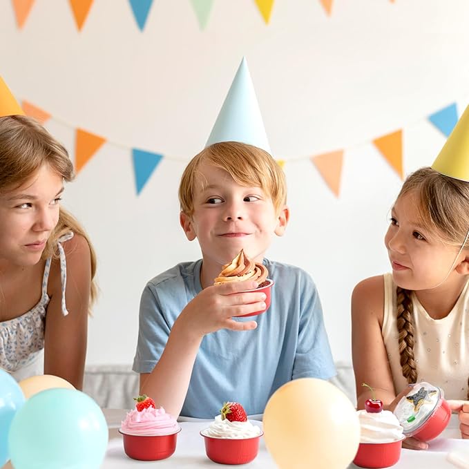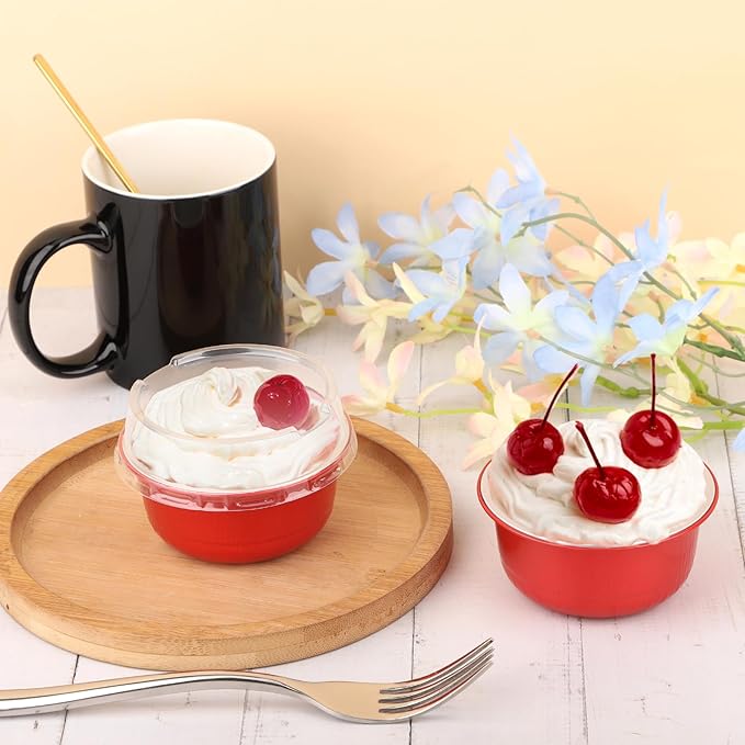 Beasea Disposable Baking Cups With Lids, 100 Pack 6.1oz 180ml Aluminum Foil Ramekins Round Baking Mini Cupcake Oven Cups for Party - Red