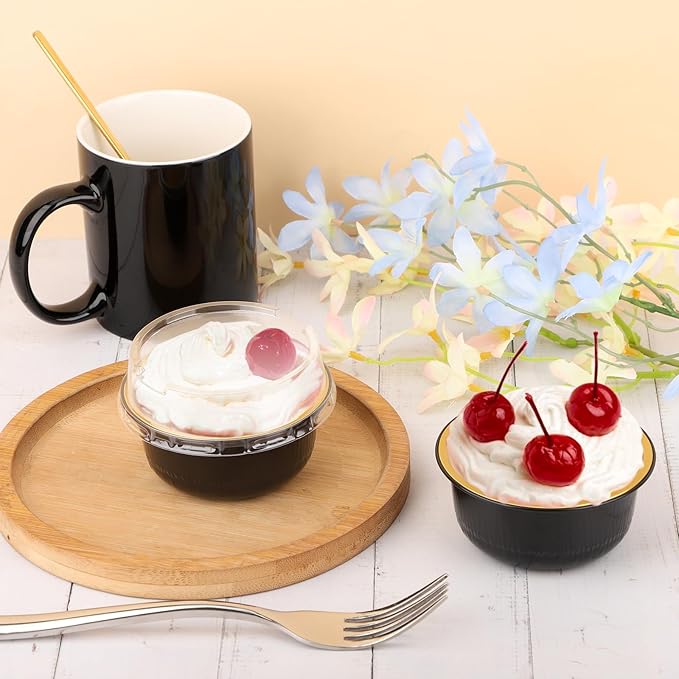 Beasea Aluminum Foil Ramekin Cups With Lids, 100 Pack 6.1oz 180ml Mini Disposable Foil Ramekins Aluminum Round Oven Baking Cupcake Cups for Party - Black Gold