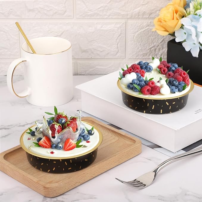 Beasea Disposable Baking Cups, 100 Pack 7.3oz 215ml Aluminum Ramekins Foil Baking Cups 4" Cupcake Aluminum Mini Baking Cups No Lids for Party - Gold/in Black