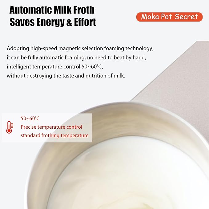 - Intelligent Temperature Control: The milk frother has a built-in intelligent temperature control system that monitors and adjusts the heating temperature in real time to ensure that the milk stays within the appropriate temperature range during the preparation process. This precise temperature control technology helps to avoid the problem of overheating of milk that leads to loss of nutrients or poor taste.