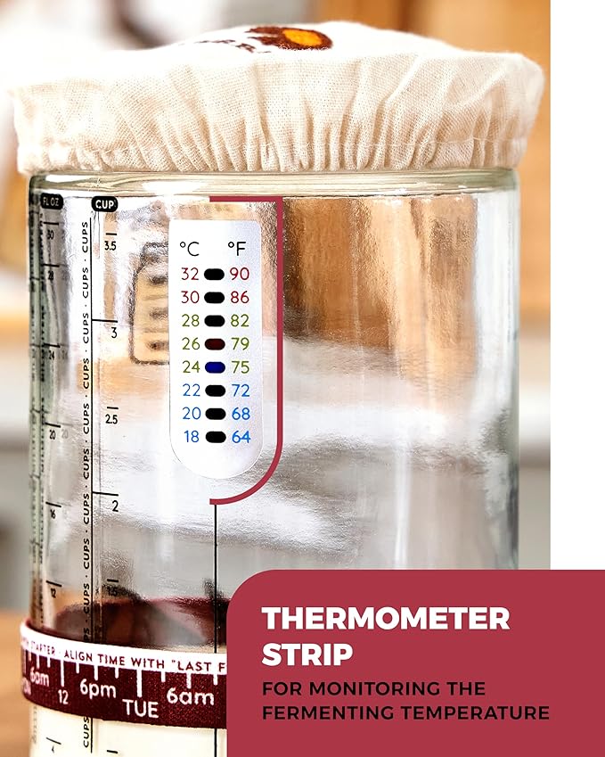 - TRACK TEMPERATURE & GROWTH: The thermometer helps you find the ideal warm spot for your sour dough starter and the tracker band tracks your feeding schedule and growth.