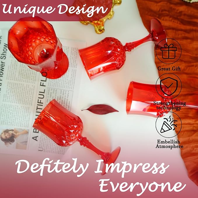 - 🍷🍷🍷【Product Description】 This set includes 48 retro-style red party plastic wine glasses, providing ample quantity to meet your daily use and replacement needs. The elegant and sophisticated design makes your wedding reception unique.