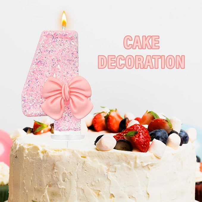 Birthday Cake Candles, Pink Glitter with Bow Cake Candles, Birthday Party Cake Toppers, Cute Birthday Candle Decorations (4)