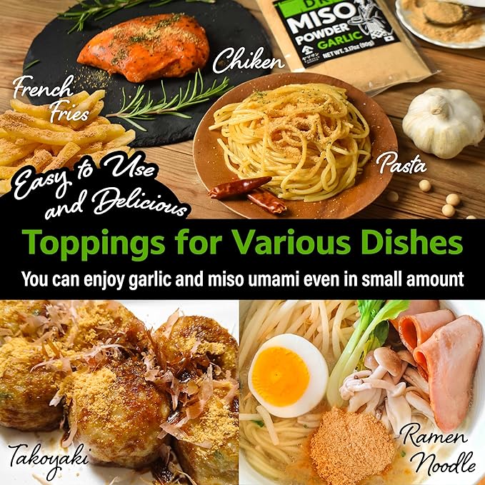 - GARLIC MISO UMAMI IN POWDER FORM – A bold Japanese garlic miso seasoning combining freeze-dried miso powder with aromatic Japanese garlic. This dry miso powder adds rich umami and savory garlic flavor to any dish, with just a small amount delivering full-bodied taste and aroma.