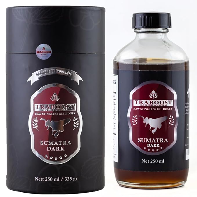 - TraBoost Stingless Bee Honey, harvested by stingless bees in the pristine forest of Sumatra, Indonesia. Features a distinctive tangy flavor and thinner texture.