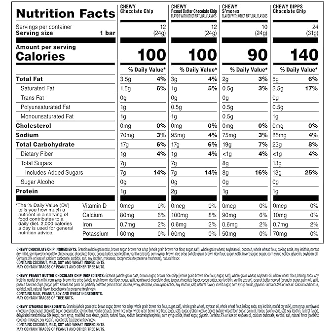 - Quaker Chewy Granola Bars, Chewy & Dipps 4 Flavor Variety Pack includes (24) Chewy Dipps Chocolate Chip, (12) Chewy Chocolate Chip, (12) Peanut Butter Chocolate Chip, (10) Smores flavors